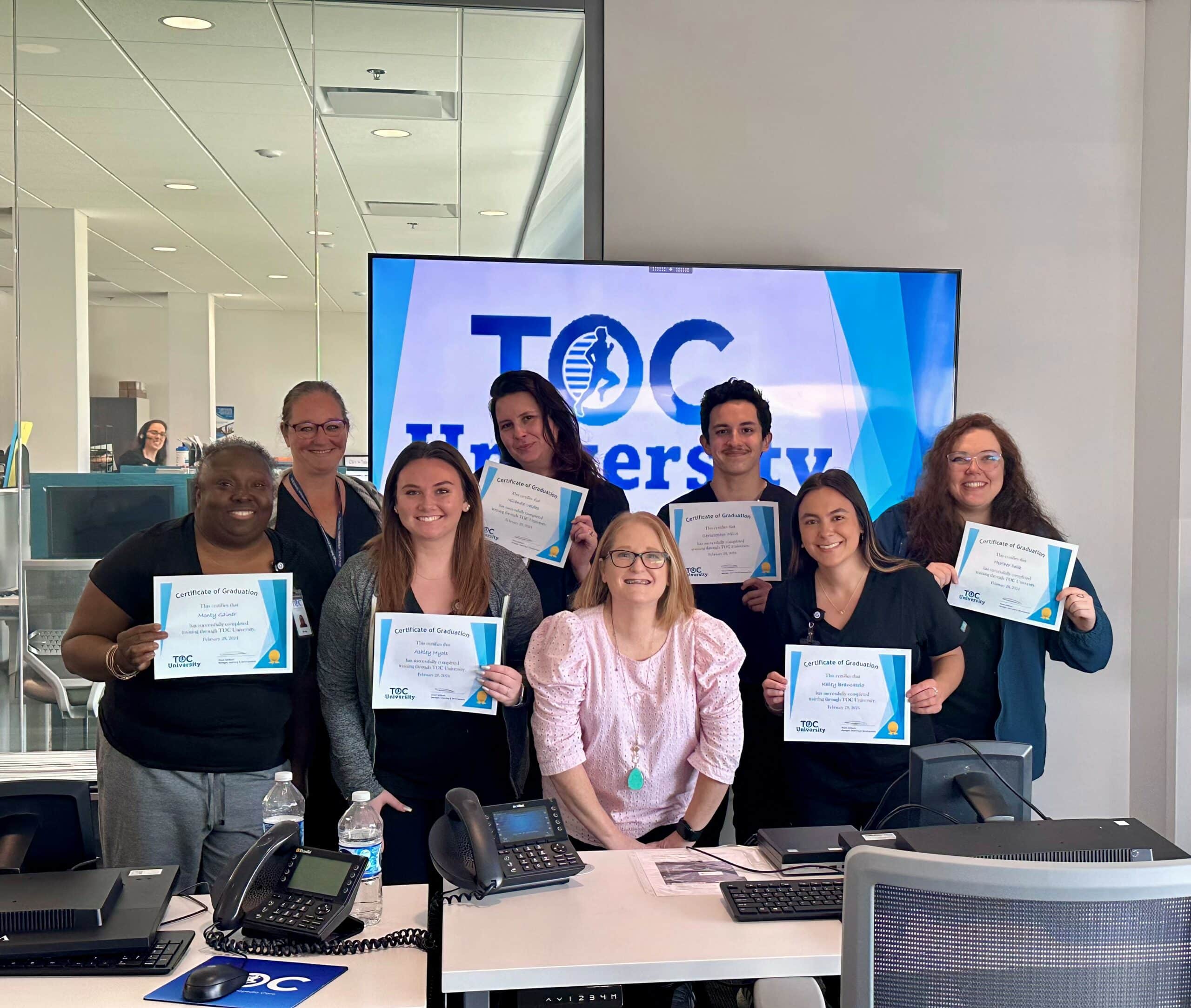 Last week marked a significant milestone as we celebrated the graduation of our first cohort of team members from TOC University. Established with the primary objective of enriching the experience of TOC team members, TOC University offers a comprehensive training and educational platform for both newcomers and seasoned staff alike. The curriculum at TOC University covers a wide array of topics including thorough instruction on TOC Culture, mastery of computer programs, and fundamental job responsibilities. As an initiative that continues to evolve, TOC University is committed to providing ongoing education opportunities, empowering team members to deliver outstanding patient care and consistently exceptional experiences for the community.